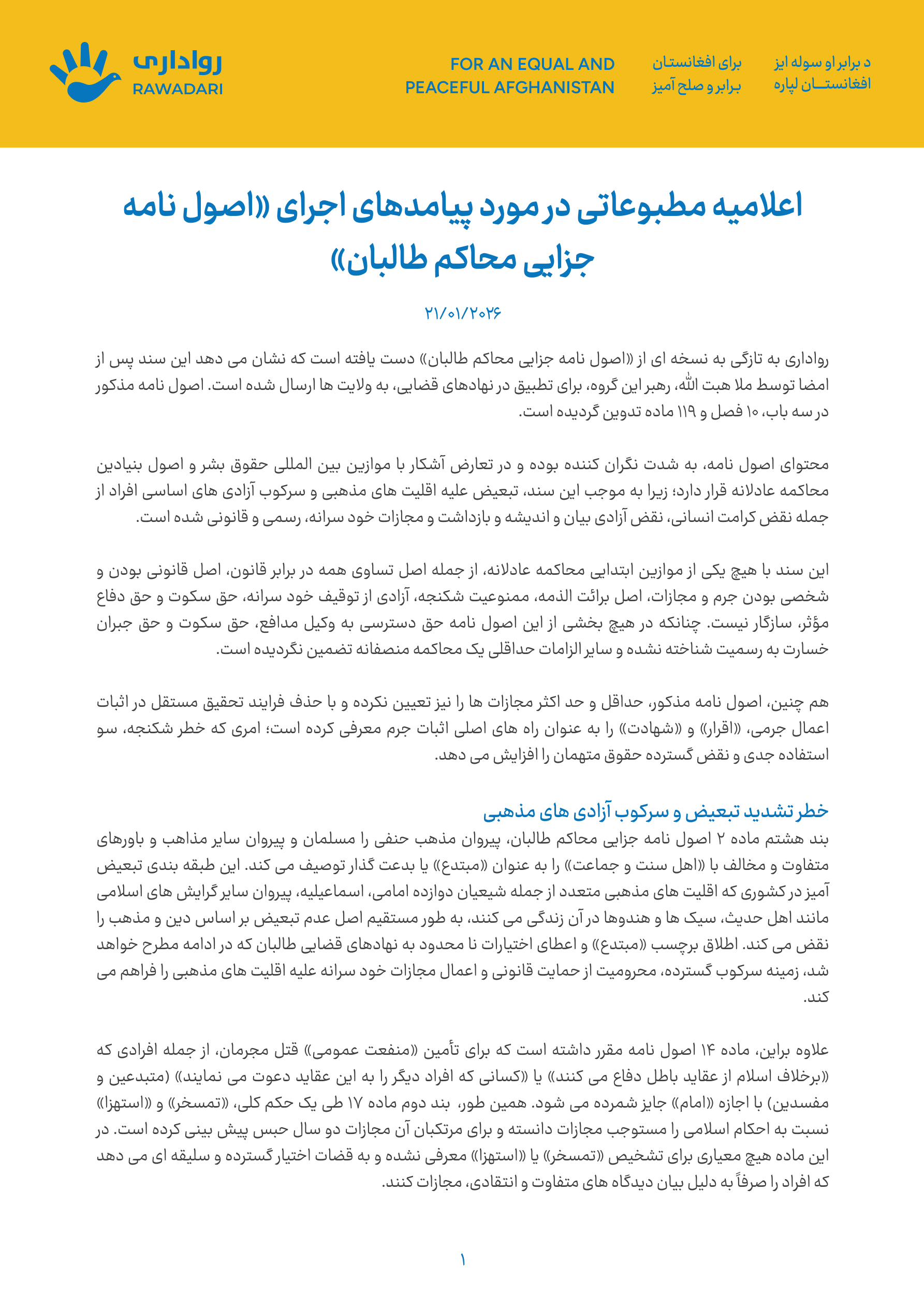 فرخنده: در اعلامیه تازه نهاد «رواداری» نشان میدهد که اجرای «اصولنامه جزایی محاکم طالبان» بیش از هر گروهی، زنان، کودکان و اقلیتهای مذهبی را در معرض خشونت، مجازاتهای بدنی و سلب حقوق اساسی قرار داده و نظامی را نهادینه کرده است که سرکوب، تبعیض و مجازات خودسرانه را مشروع جلوه میدهد.